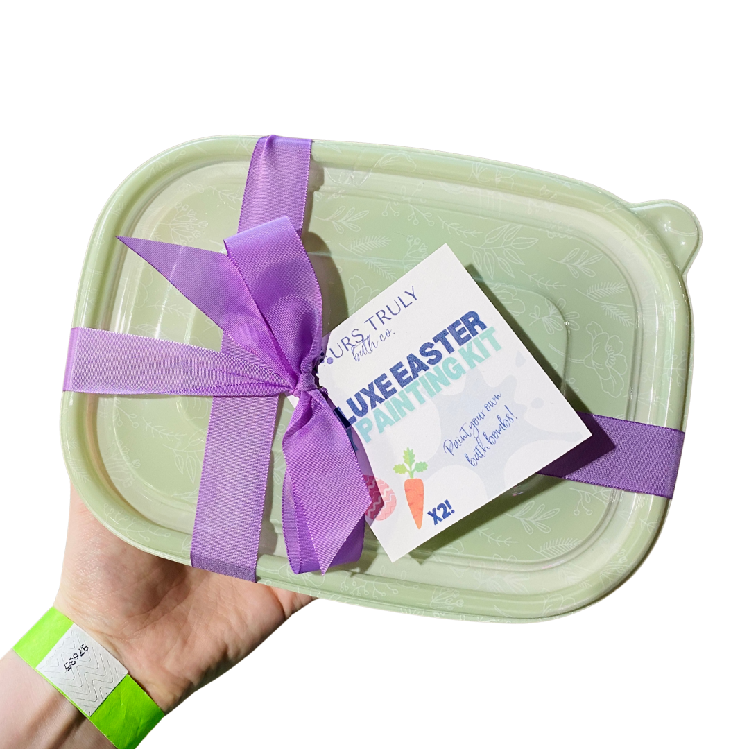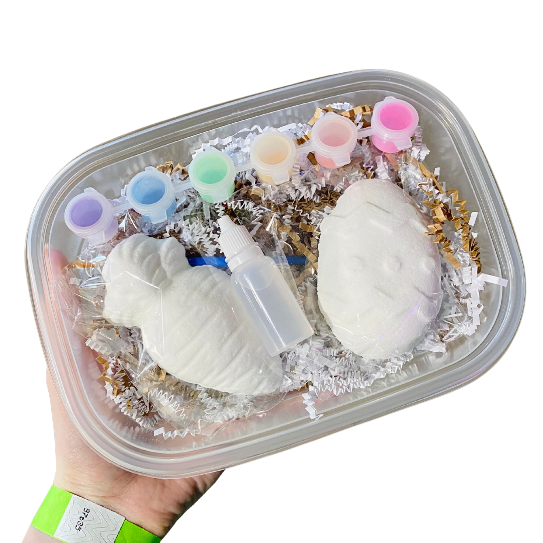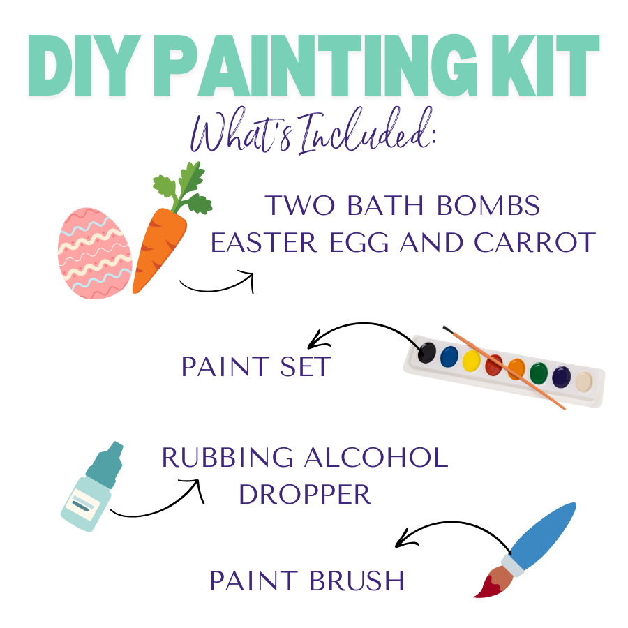Each kit comes with a themed bath bomb, 6 paint colors (our powder colorant we use the make our products), a rubbing alcohol dropper and a paint brush.