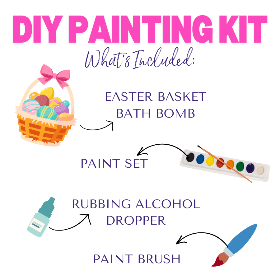 Each kit comes with a themed bath bomb, 6 paint colors (our powder colorant we use the make our products), a rubbing alcohol dropper and a paint brush.