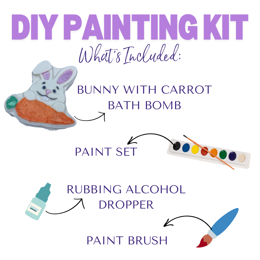 Each kit comes with a themed bath bomb, 6 paint colors (our powder colorant we use the make our products), a rubbing alcohol dropper and a paint brush.