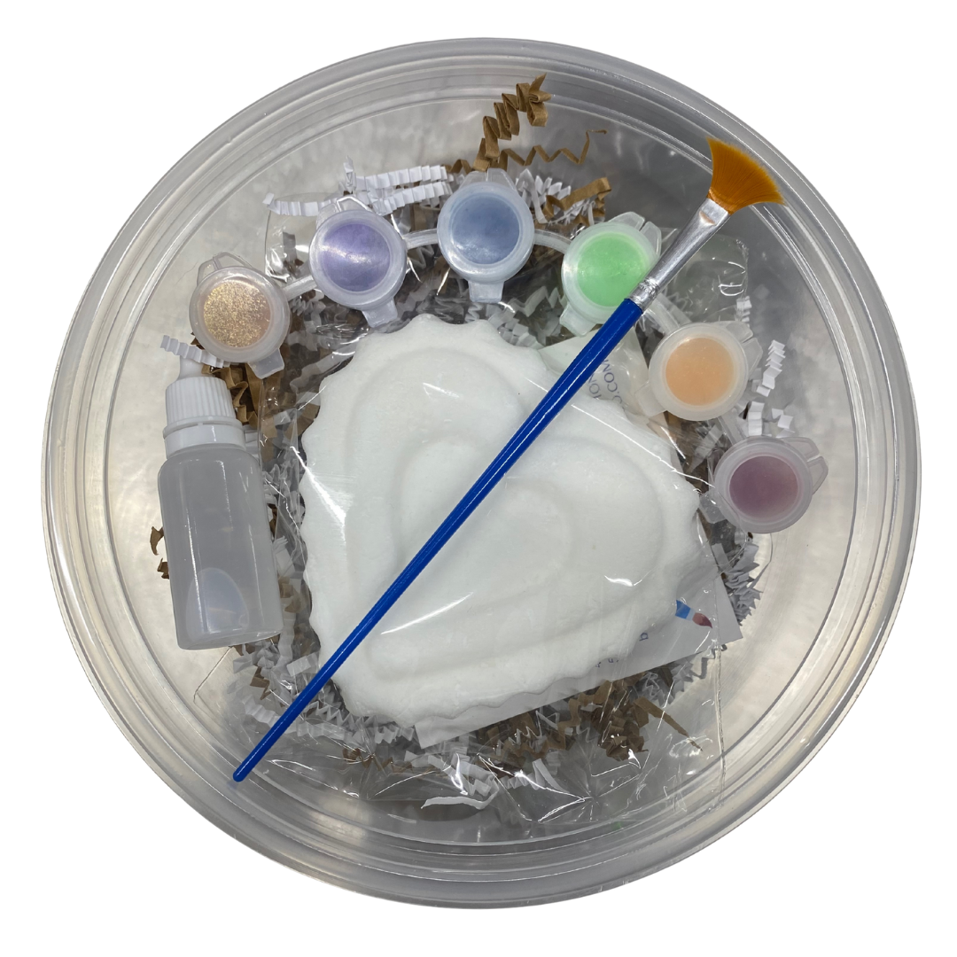 Each kit comes with a themed bath bomb, 6 paint colors (our powder colorant we use the make our products), a rubbing alcohol dropper and a paint brush.